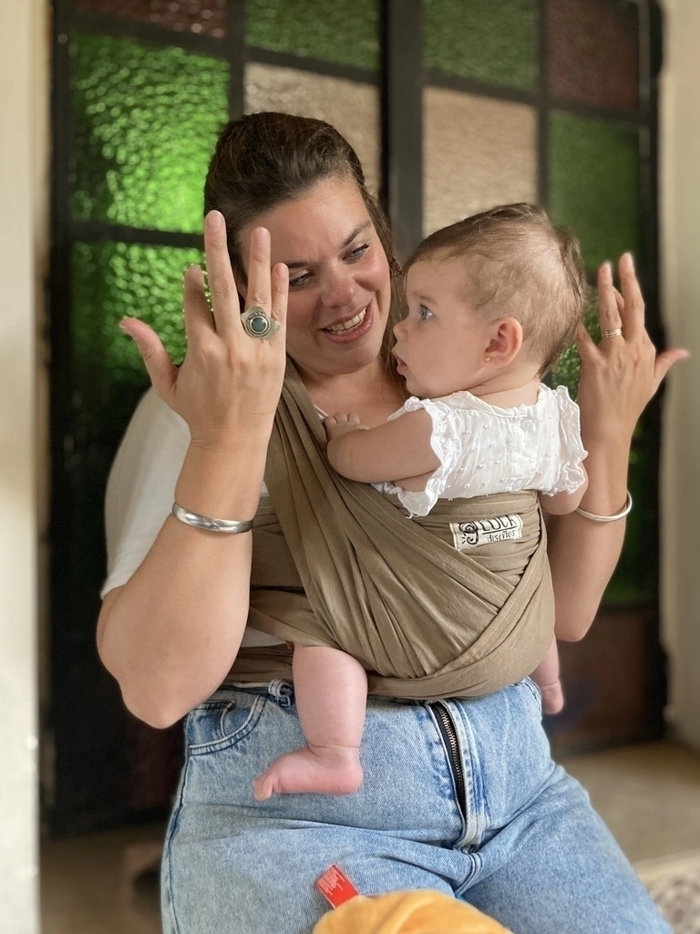 Ajuste punto por punto que brinda soporte y contención a toda la estructura ósea del bebé y se adapta a cualquier talle de adulto.